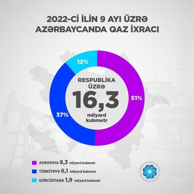 Азербайджан в январе-сентябре 2022 года экспортировал в Европу 8,3 миллиарда кубометров газа.