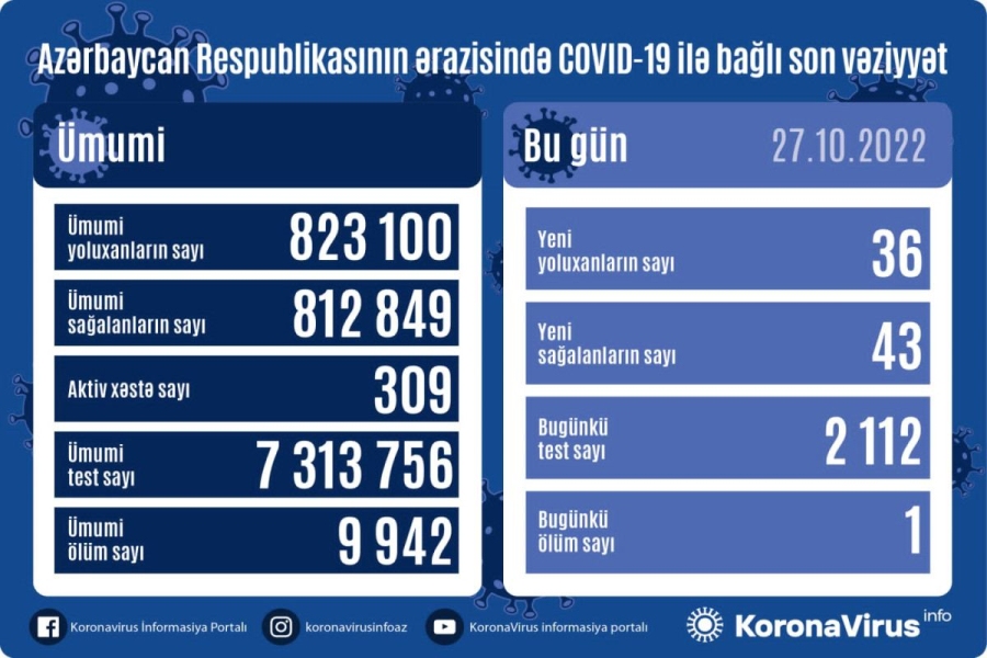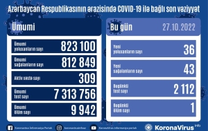 На сегодня в Азербайджане выявлены в целом 823 100 случаев заражения коронавирусной инфекцией, 812 849 человек вылечились, 9 942 – скончались, число активных больных составляет 309.
