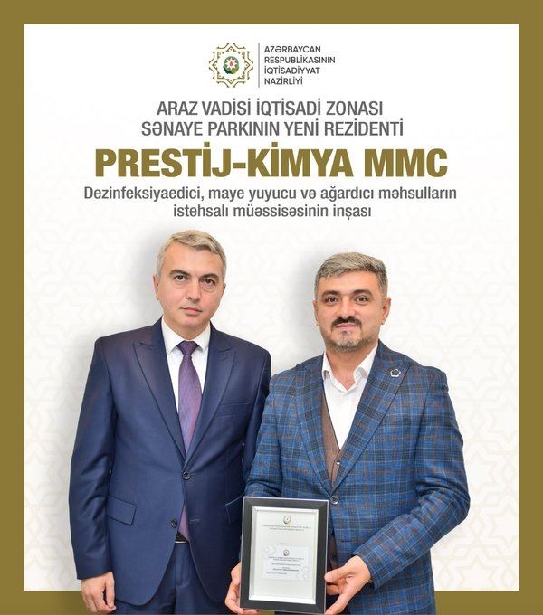 "ООО Prestij-Kimya присвоен статус резидента "Аразской экономической долины". Новый резидент построит завод по производству дезинфицирующих средств, жидких моющих средств и отбеливателей", - отмечает министр.