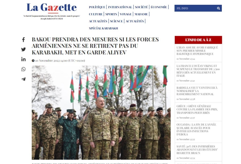 На французском новостном портале "La Gazette" опубликована статья под названием «Официальный Баку предпримет необходимые шаги, если армянские элементы не покинут Карабах».