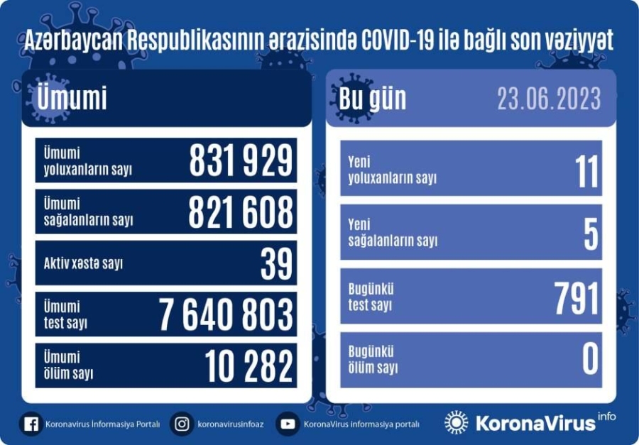 В Азербайджане за последние сутки выявлено еще 11 случаев заражения коронавирусом (5 человек вылечились, умерших нет) передает в пятницу Оперативный штаб при Кабинете министров Азербайджана.