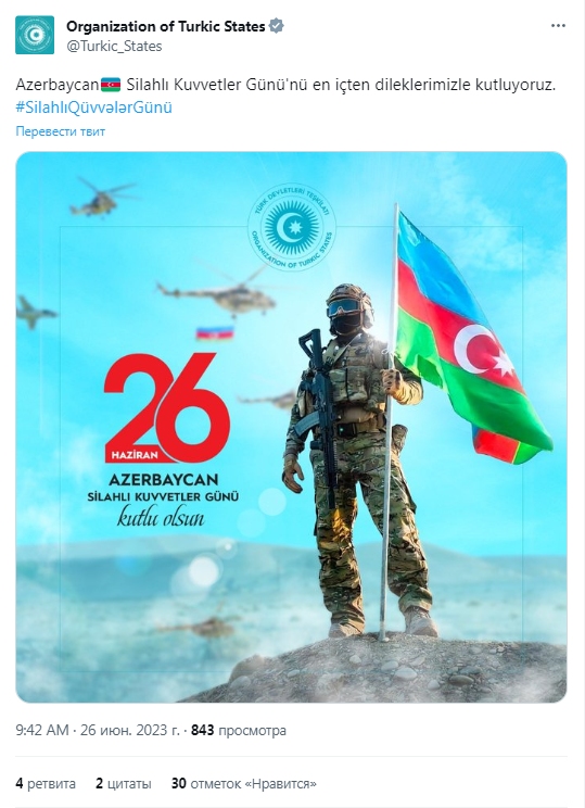 Организация тюркских государств (ОТГ) поздравила Азербайджан с 26 июня - Днем Вооруженных Сил.