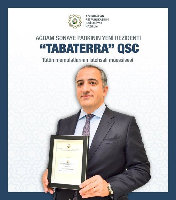 "Инвестиционная стоимость проекта ЗАО "Tabaterra" составляет 40,5 миллиона манатов. Компания создаст на территории промышленного парка предприятие по производству табачных изделий. Реализация проекта позволит создать рабочие места для 300 человек и будет способствовать росту экономической активности и занятости в Карабахе", - говорится в публикации министра.