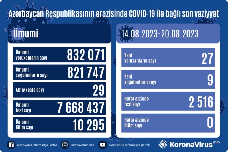 В Азербайджане за последнюю неделю (14.08.2023 - 20.08.2023) выявлено 27 случаев заражения коронавирусом, 9 человек вылечились,Оперативный штаб при Кабмине страны.